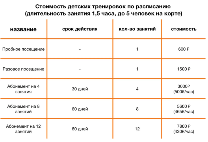 В нашем клубе мы предоставляем детям ракетки и мячи, нужна будет только спортивная форма и очки, которые тоже можно приобрести у нас за небольшую цену